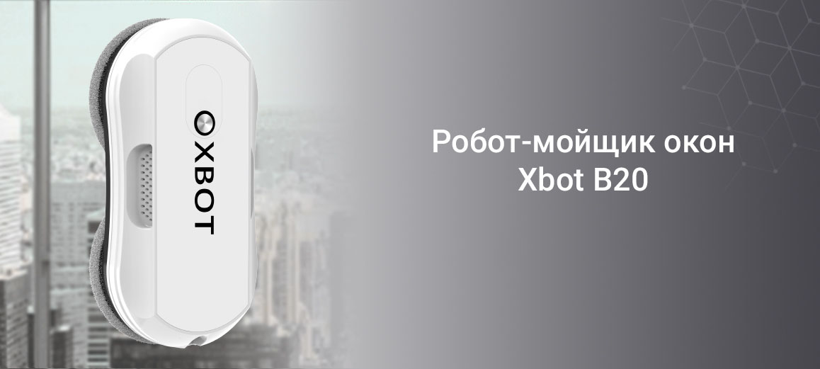 Xbot B20 выполнен в компактном корпусе белого цвета с чёрными элементами. Небольшая толщина 58 мм позволяет устройству работать на окнах и других гладких поверхностях без лишнего выступа, а вес менее 1 кг упрощает установку и перенос. Конструкция рассчитана на стабильную фиксацию на стекле при работе от сети.